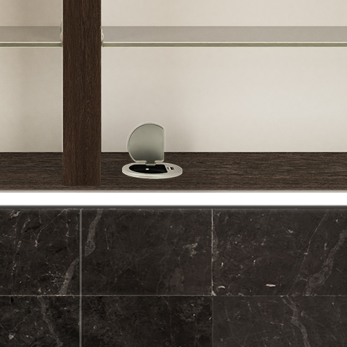 Du kan også vælge en stikkontakt. Det smarte 2-dørs badeværelsesskab , der er udstyret med det, giver dig mulighed for at tilslutte en hårtørrer eller et glattejern til det. Den induktive oplader giver dig mulighed for at oplade din smartphone, mens du gør dig klar til at forlade huset om morgenen.