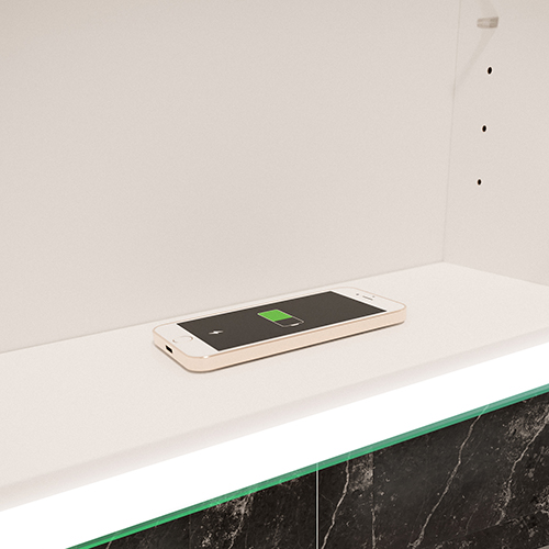 Oplad din telefon under dit morgentoilet! Brug induktionsopladeren, der er placeret i midten af skabet, til altid at oplade din telefon. Du skal blot placere din telefon på induktionssymbolet, så begynder din smartphone at blive opladet.