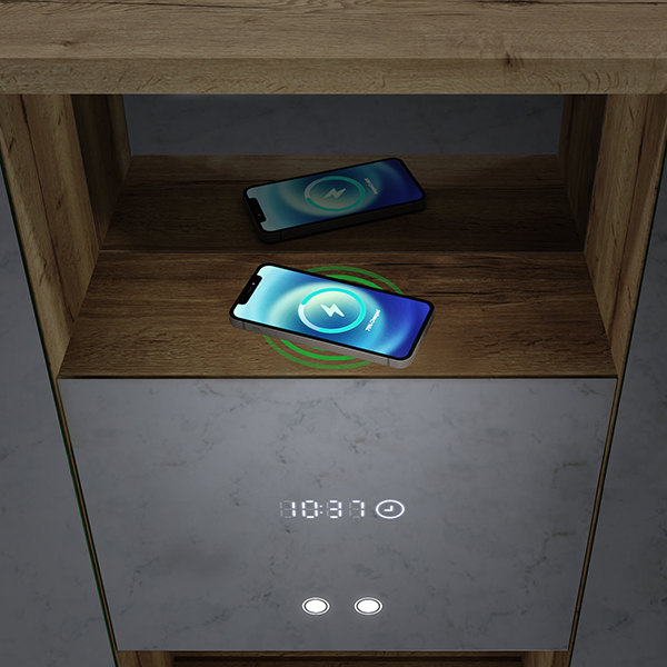 Brug induktionen, der er placeret midt i skabet på morgentoilettet, til at oplade din telefon. Processen starter, når du placerer din smartphone i det dertil indrettede felt.