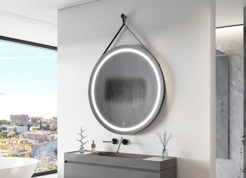 Det runde spejl med belysning er fastgjort til et læderrem, som fås i tre farver: sort, lysebrun og mørkebrun. Med sådan en personalisering kan du skræddersy spejlet til din egen smag og indretningsstil. Stilfuld rem i ægte læder.