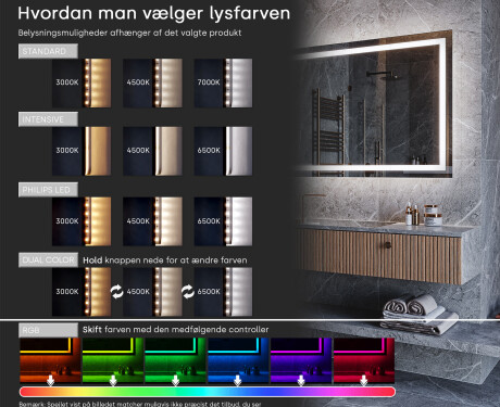 Fremhæv din skønhed i det bedste lys med RGB LED Colour! Vores LED-belysning giver dig en række forskellige farver og effekter, så du kan tilpasse belysningen til dit humør og behov. Vores LED-baggrundsbelysning giver mulighed for glidende overgange mellem farverne, hvilket skaber en fantastisk farveeffekt i dit rum.